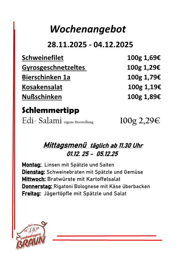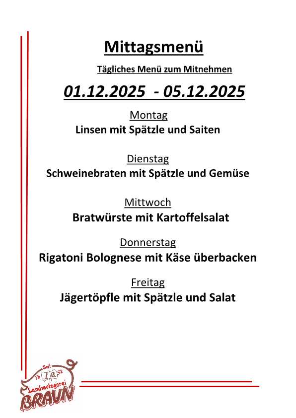 Ob für die Mittagspause oder den schnellen Genuss zwischendurch: In unserer Heißtheke erwarten Sie täglich wechselnde, frisch zubereitete Mittagsgerichte – natürlich in bewährter Metzgerei-Braun-Qualität. Hausgemachte Klassiker, herzhafte Braten, saftige Schnitzel, feine Beilagen und saisonale Spezialitäten – alles mit viel Liebe gekocht und direkt zum Mitnehmen.